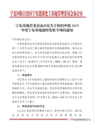 关于组织申报2019年度宁东基地创新发展专项的通知