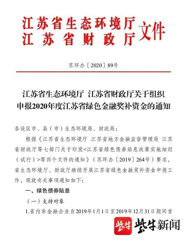3月25日,记者从江苏省生态环境厅获悉,江苏省生态环境厅、财政厅日前印发《关于组织申报 2020 年度江苏省绿色金融奖补资金的通知》(以下简称《通知》)。根据《通知》,2020 年度江苏省绿色金融奖补资金已经开始了。奖补资金可分为绿色债券贴息、绿色产业企业发行上市奖励、环境污染责任保险保费补贴和绿色担保奖补四种类型。
