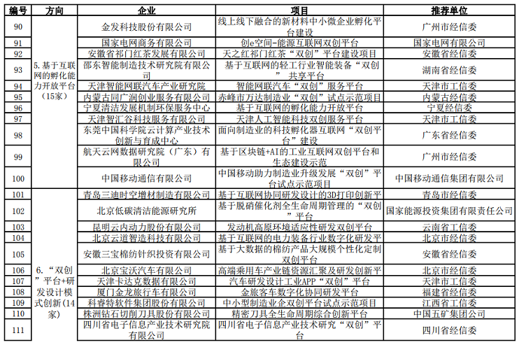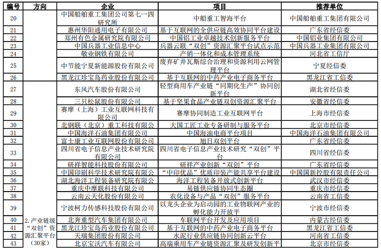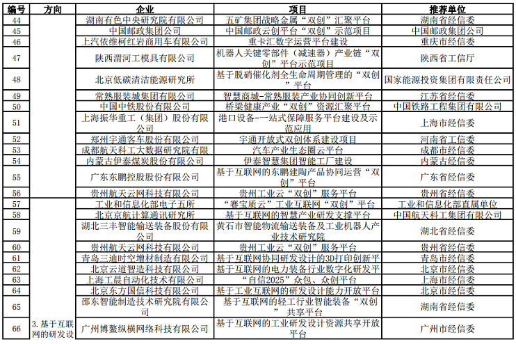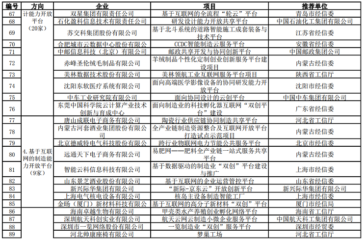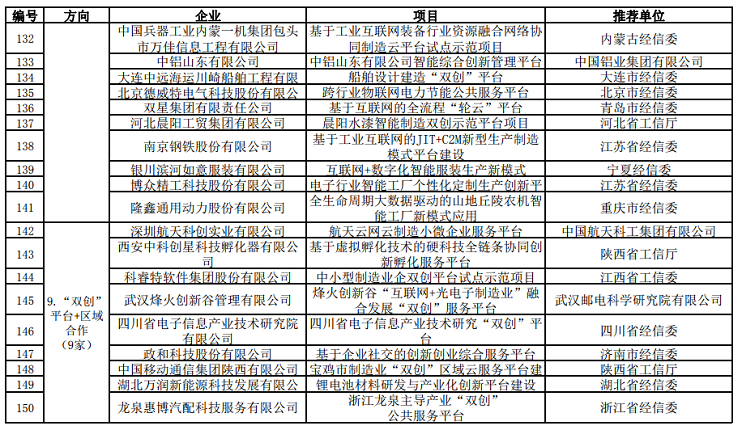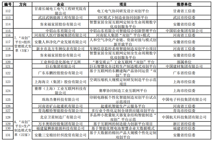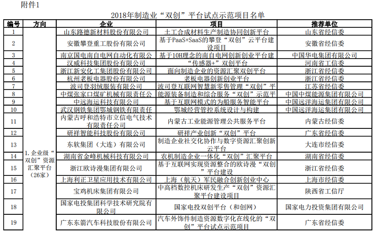 为深入贯彻《国务院关于深化制造业与互联网融合发展的指导意见》(国发〔2016〕28号),结合《工业和信息化部办公厅关于组织开展2018年制造业“双创”平台试点示范项目申报工作的通知》(工信厅信软函〔2018〕221号),经企业自主申报、地方推荐和专家评审,工业和信息化部拟将土工合成材料生产制造协同创新平台等150个项目核定为2018年制造业“双创”平台试点示范项目(以下简称“试点示范项目”)。现对试点示范项目名单进行公示(见附件),欢迎社会各界监督。如有异议,请在公示期内与我们联系。