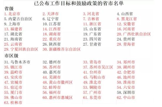 国内各省市已制订了相应实施方案,并发布了相应的工作目标和鼓励政策: